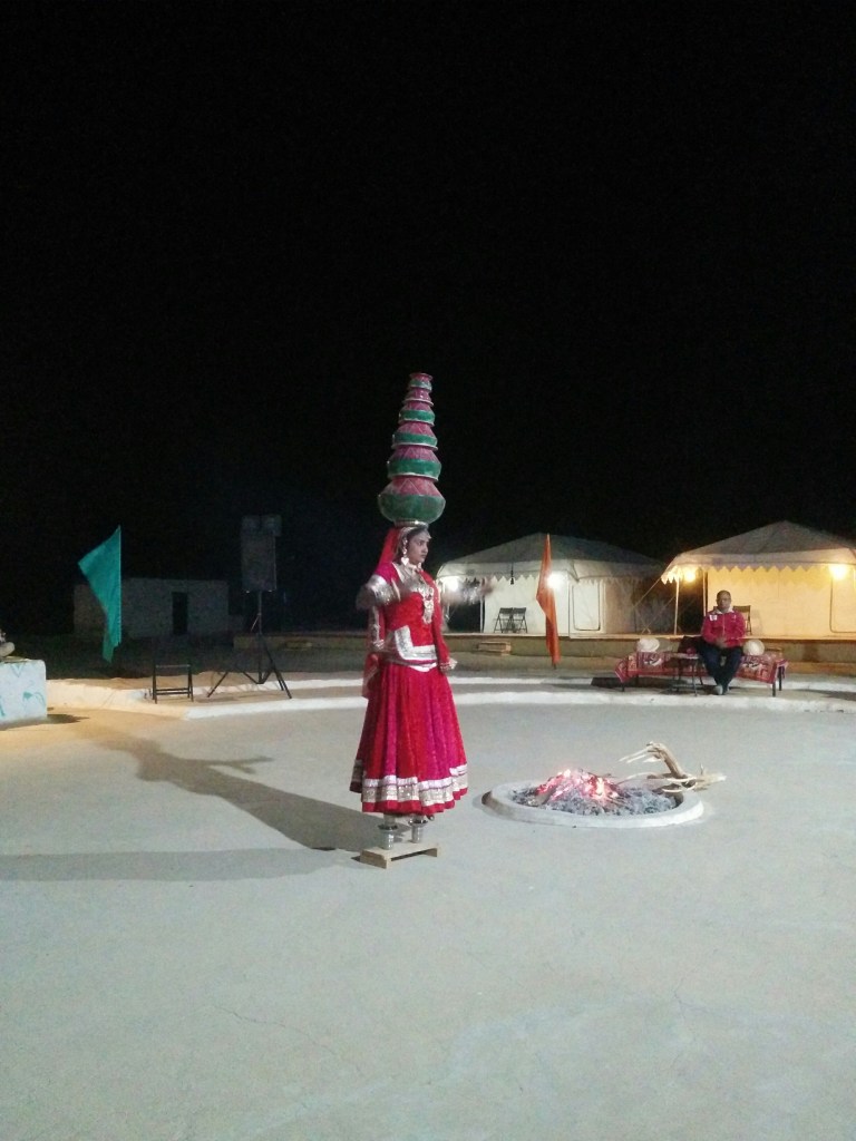 Around the desert there are many lodges built like dessert camps for night stay (varying from basic to 5* category camp stays. The starting price can be Rs. 5000 per room per night), those camps organise the cultural shows, serving some snacks to the guests (Pre-booking required to enjoy evening shows for tourists who are not staying in those camps). Starting the freezing evening under the open sky with Rajasthani folk songs, after which boosting the nightfall by elegant dancers makes the evening flawlessly beautiful around the warming fire.