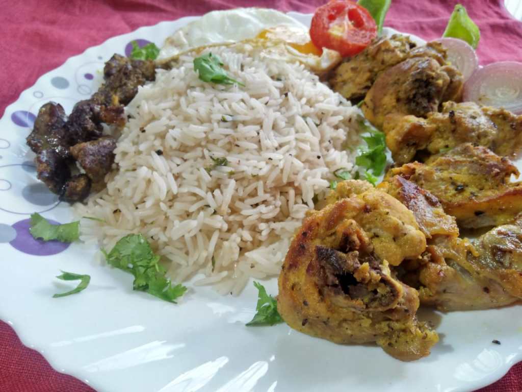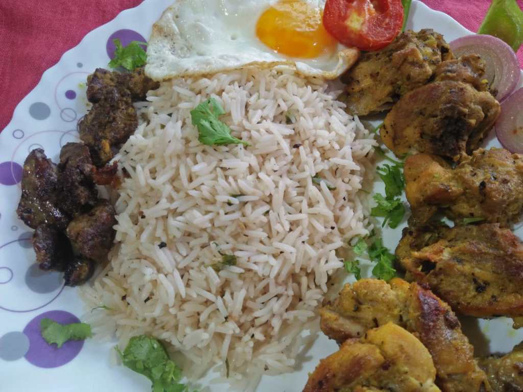 As highly aspiring is my Food crave, the lowest is my intent to cook them… So, once marinated, I took a pan, once it was heated enough, I added little oil and ghee in the pan. Once the pan was gently smoking, I added the chicken & the liver pieces all at the same time and let them cook on medium heat. After about 4-5 minutes once one side of the chicken was charred, flip the pieces and let the other side cook for another 4-5 minutes. That should do for your chicken and liver.