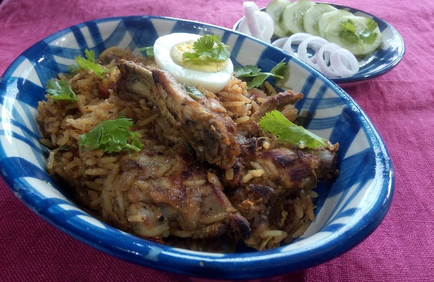 - Now mix everything, let it come to a boil, add salt, put the flame into low. Add the chicken pieces on top, sprinkle the fried onions, spread some green chilies, some coriander and cover the pot for 15-20 minutes.